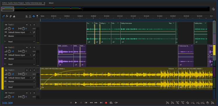 In the introduction, the music fades in at a value of 40 at -14.8 dB as I introduce myself. When Tabby introduces herself the fade peaks and the volume decreases to -30 dB over the course of 1 second. After Tabby introduces herself, the volume decreases slightly to -36.5 dB, at which it remains until the exit of the interview. I wanted the music to continue throughout the interview, but at a lower volume. In my draft the volume was -33 dB, and I had made the music introduction very complicated. Some feedback suggested that the decibel of the music was distracting, so this has been simplified in the final version. The music volume is -36.5 dB for the majority of the interview.